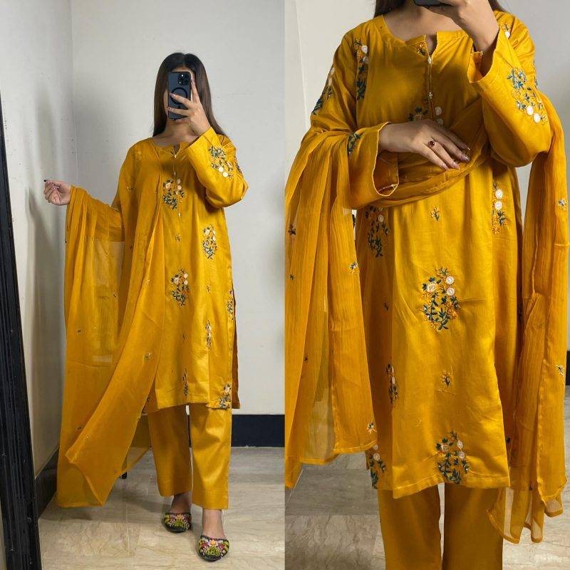 Premium White Cotton 3-Piece Embroidered Suit with Black Thread Work