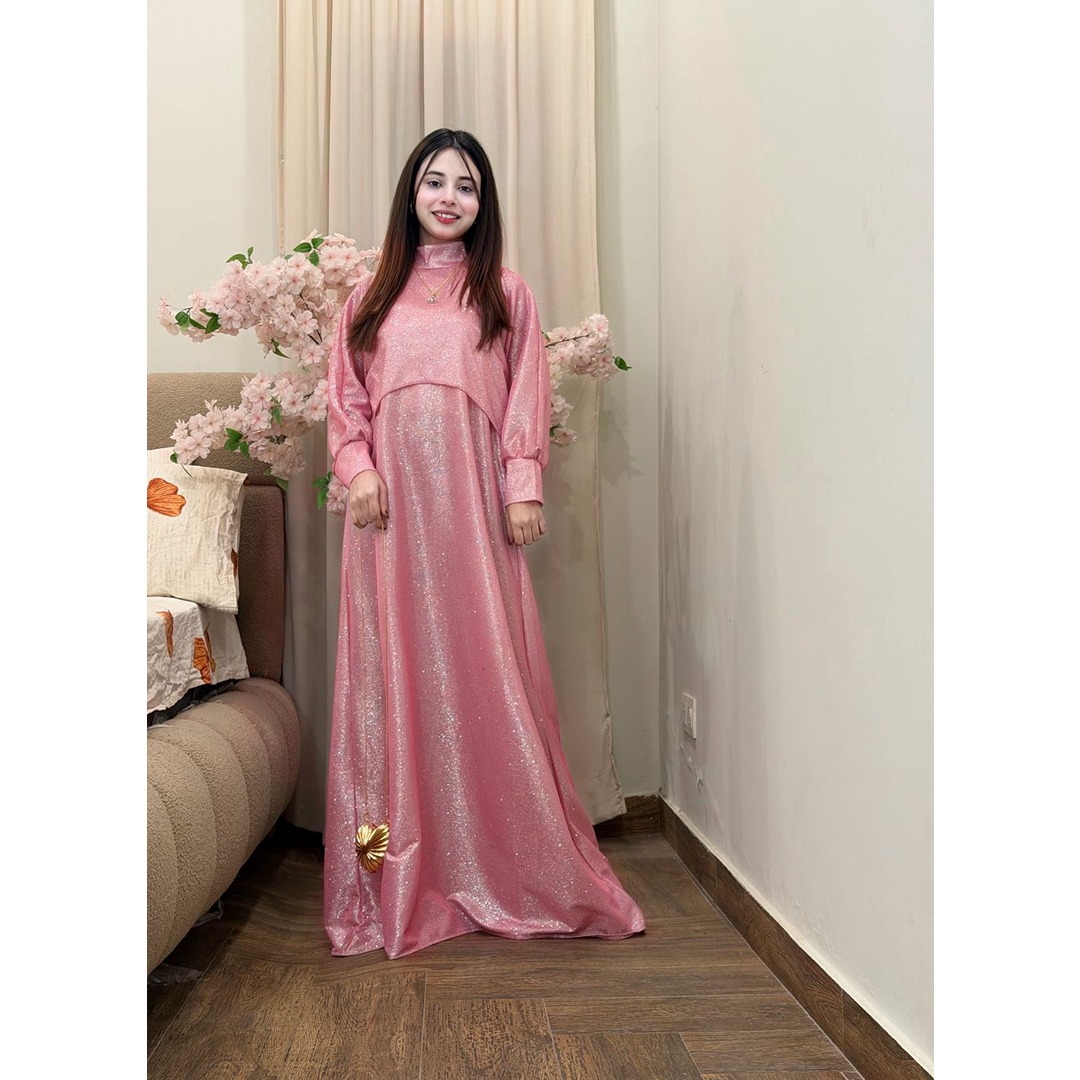 This outfit features a modest, flowing maxi paired with a beautiful shimmer cape overlay that adds grace, style, and movement.