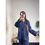 Add elegance to your nightwear wardrobe with this navy blue polka dot night suit. Designed with breathable and lightweight fabric, it ensures both comfort and style. A perfect choice for ladies nightwear and home loungewear. Free scrunchie included.