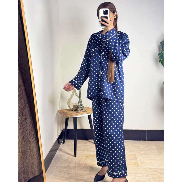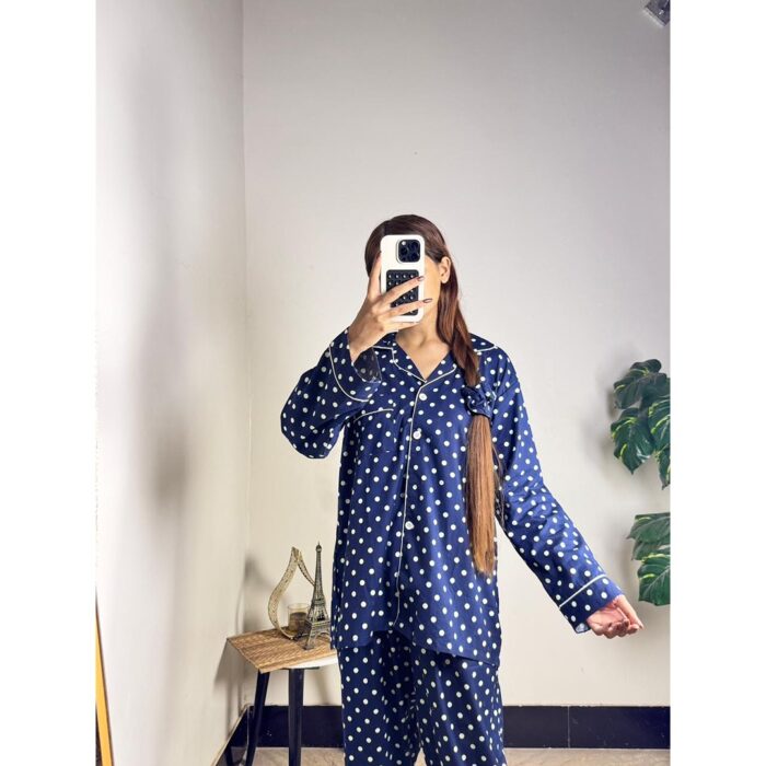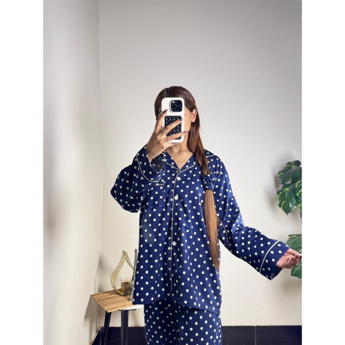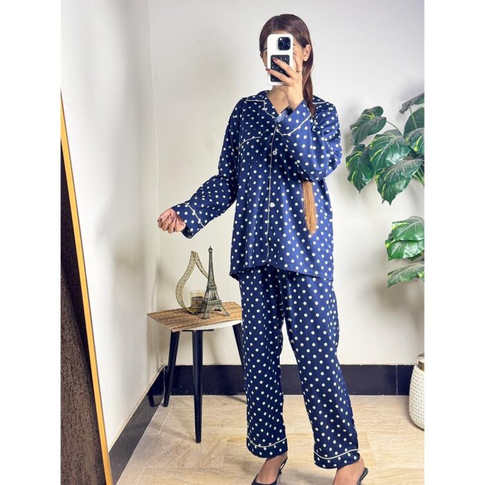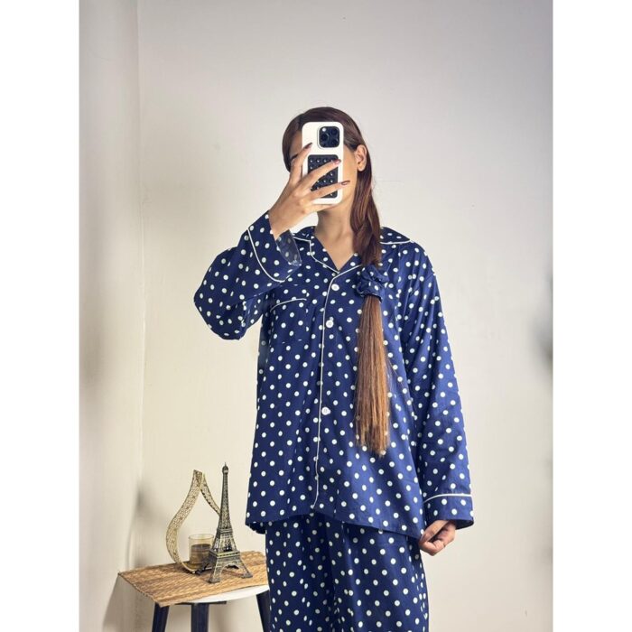 Add elegance to your nightwear wardrobe with this navy blue polka dot night suit. Designed with breathable and lightweight fabric, it ensures both comfort and style. A perfect choice for ladies nightwear and home loungewear. Free scrunchie included.