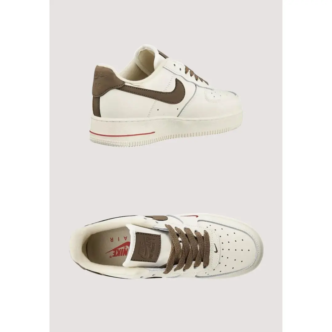 Step up your sneaker game with the Nike Air Force 1 Low Cream Brown, featuring a smooth cream leather base, rich brown Swoosh overlays, and subtle red mini Swoosh detailing for a standout modern classic look.